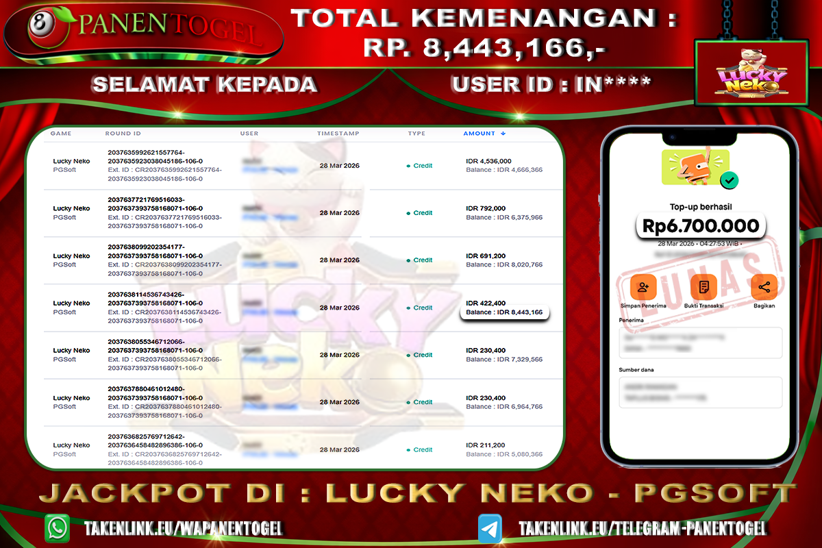 Selamat Kepada User ID : IN**** Member PANENTOGEL JACKPOT LUCKY NEKO