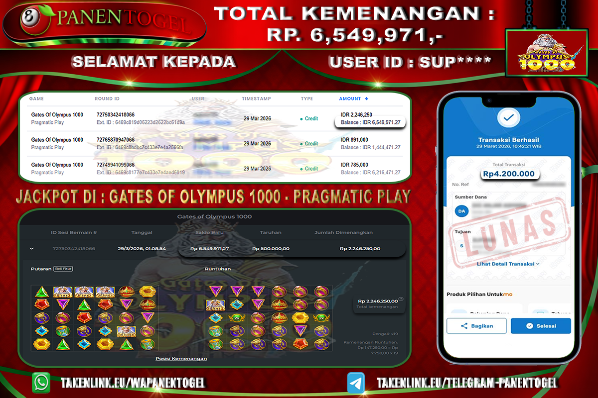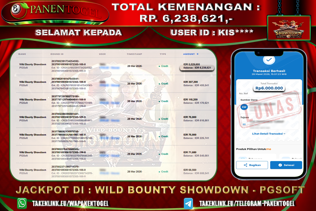 BUKTI KEMENANGAN SLOT PANENTOGEL Rp. 6.238.621, - LUNAS