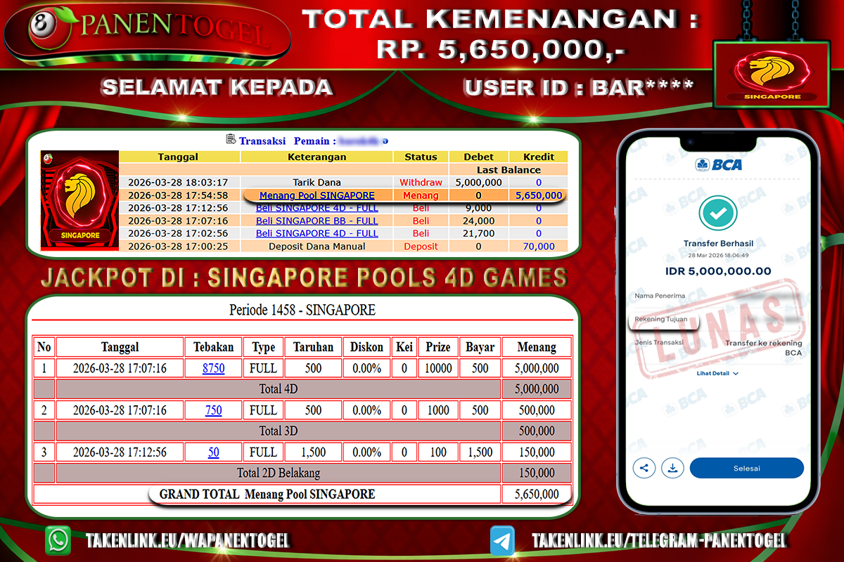 Selamat Kepada User ID : BAR**** Member PANENTOGEL JACKPOT TOGEL SINGAPORE POOLS