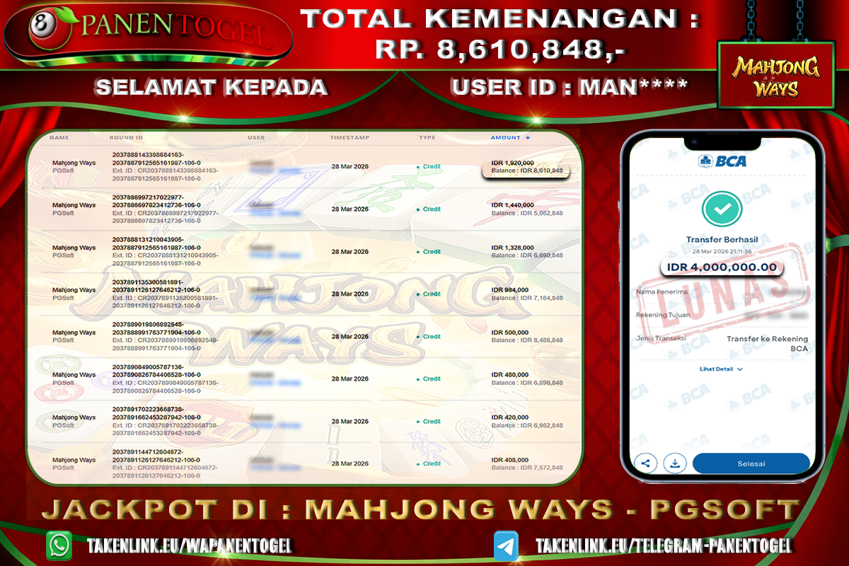 Selamat Kepada User ID : MAN**** Member PANENTOGEL JACKPOT MAHJONG WAYS