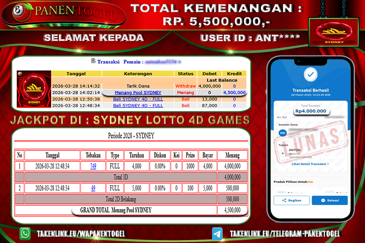 BUKTI KEMENANGAN TOGEL SYDNEY LOTTO PANENTOGEL Rp. 5.500.000, - LUNAS