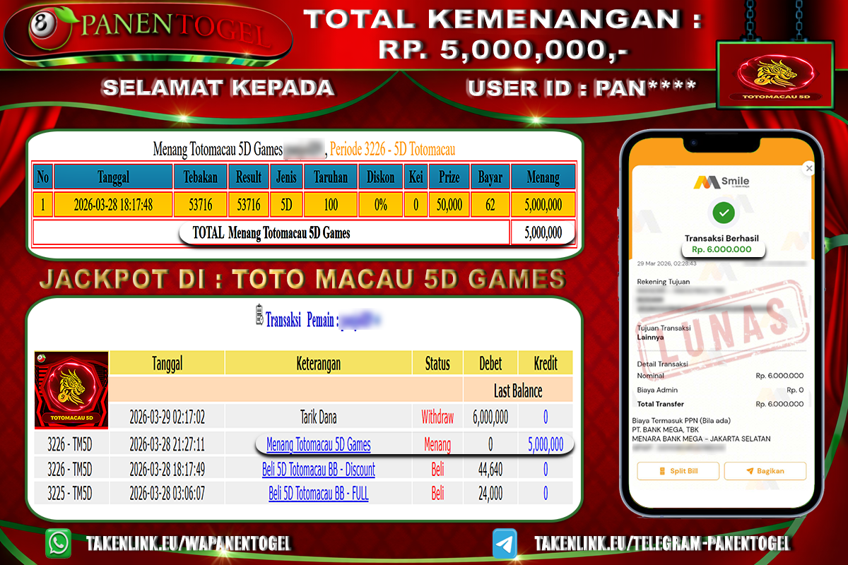 BUKTI KEMENANGAN TOGEL TOTO MACAU 5D GAMES PANENTOGEL Rp. 5.000.000, - LUNAS