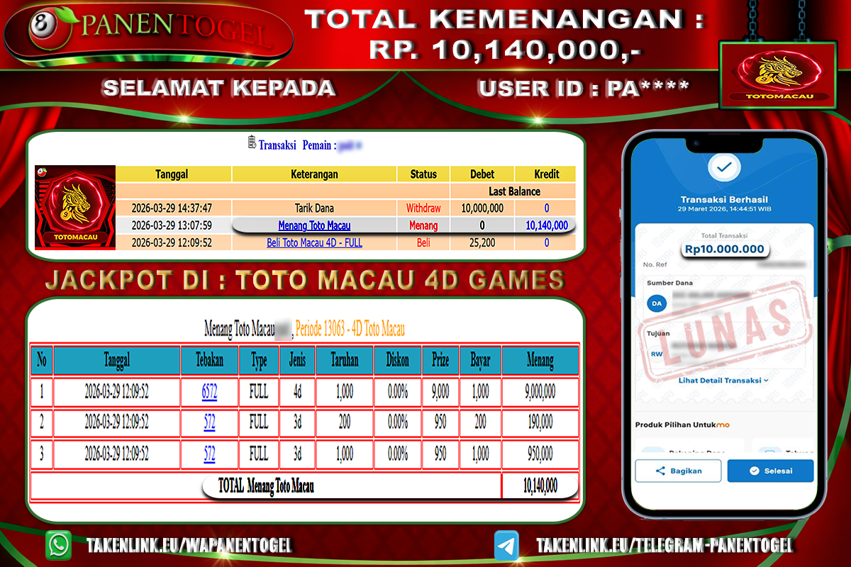 BUKTI KEMENANGAN TOGEL TOTO MACAU 4D GAMES PANENTOGEL Rp. 10.140.000, - LUNAS