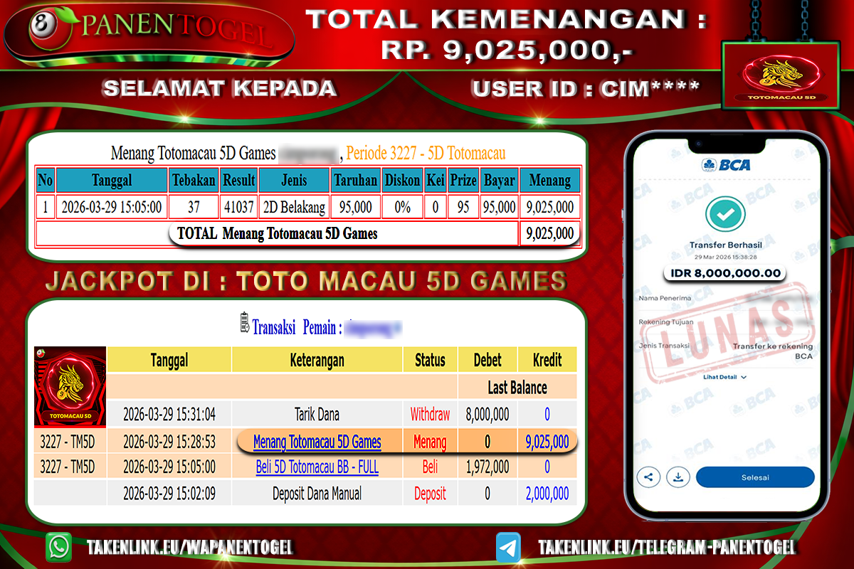 BUKTI KEMENANGAN TOGEL TOTO MACAU 5D GAMES PANENTOGEL Rp. 9.025.000, - LUNAS