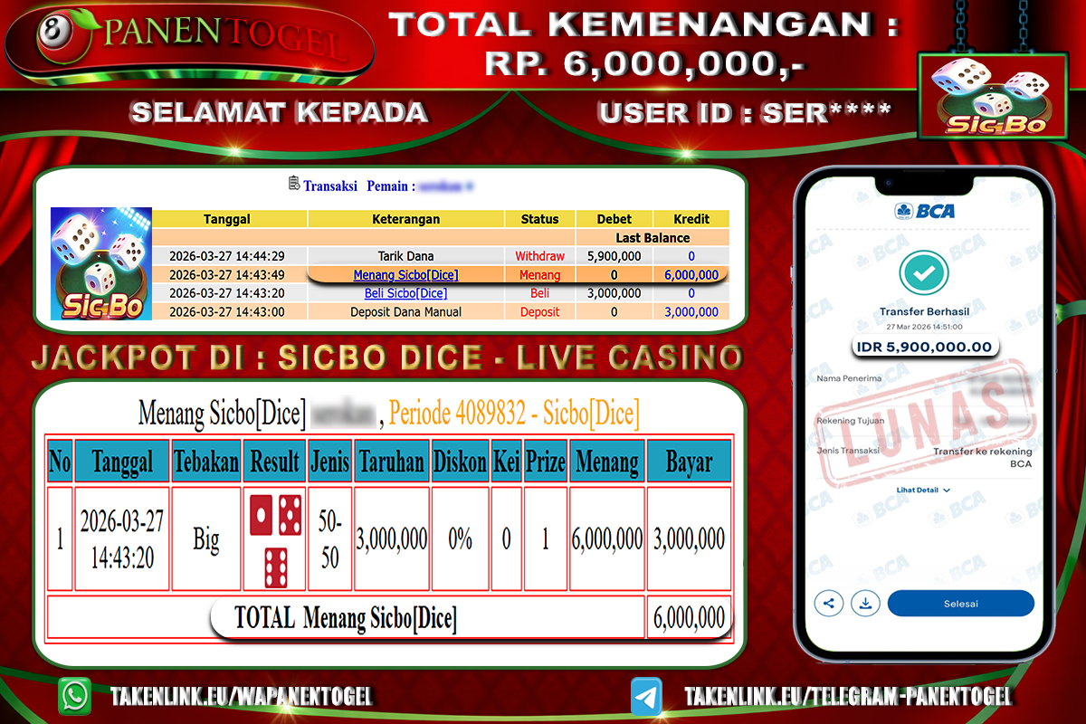 BUKTI KEMENANGAN CASINO SICBO DICE PANENTOGEL Rp. 6.000.000, - LUNAS
