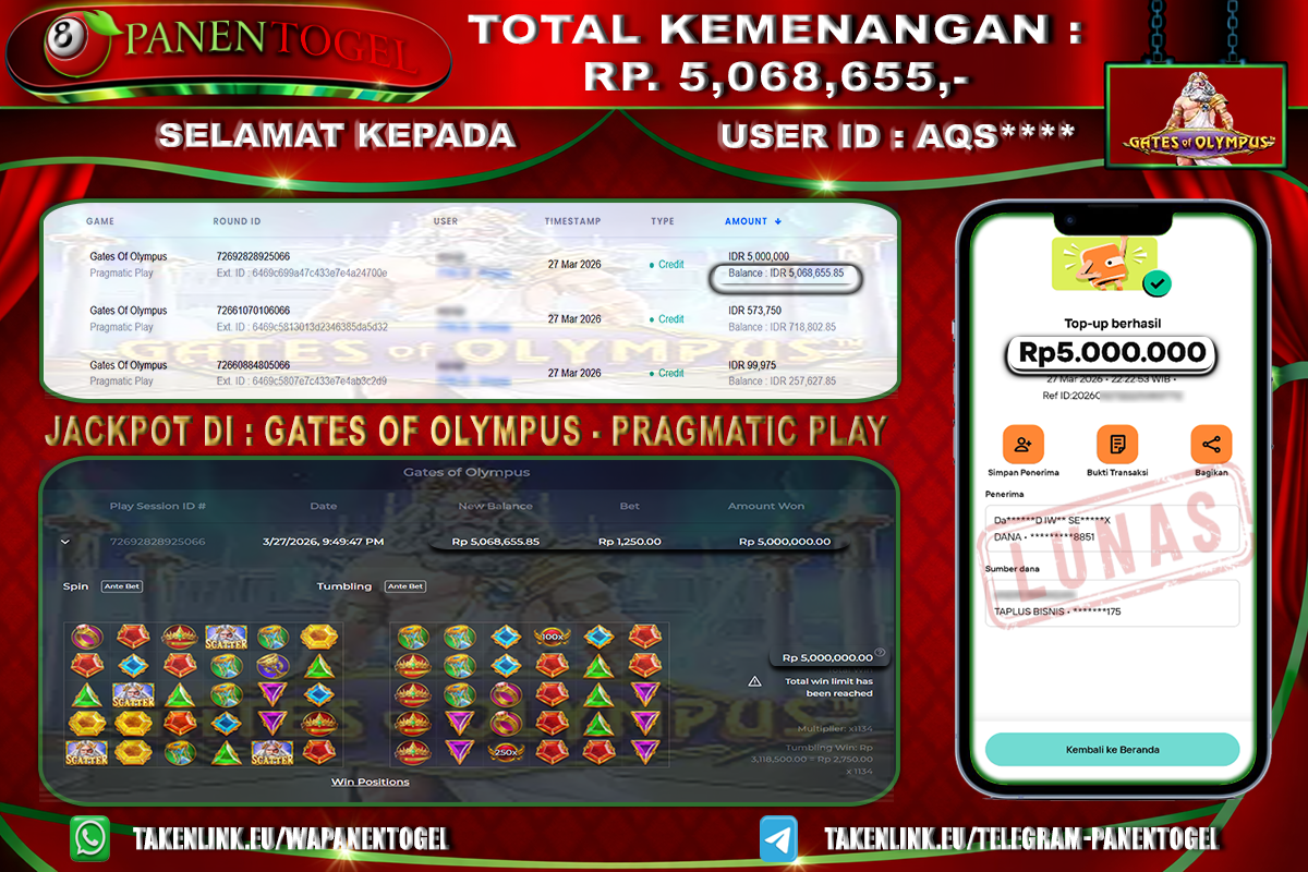 Selamat Kepada User ID : AQS**** Member PANENTOGEL JACKPOT GATES OF OLYMPUS 1000