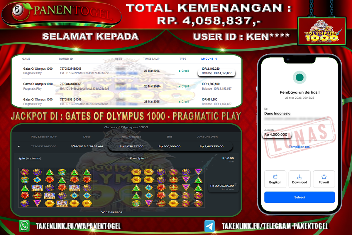 Selamat Kepada User ID : KEN**** Member PANENTOGEL JACKPOT GATES OF OLYMPUS 1000