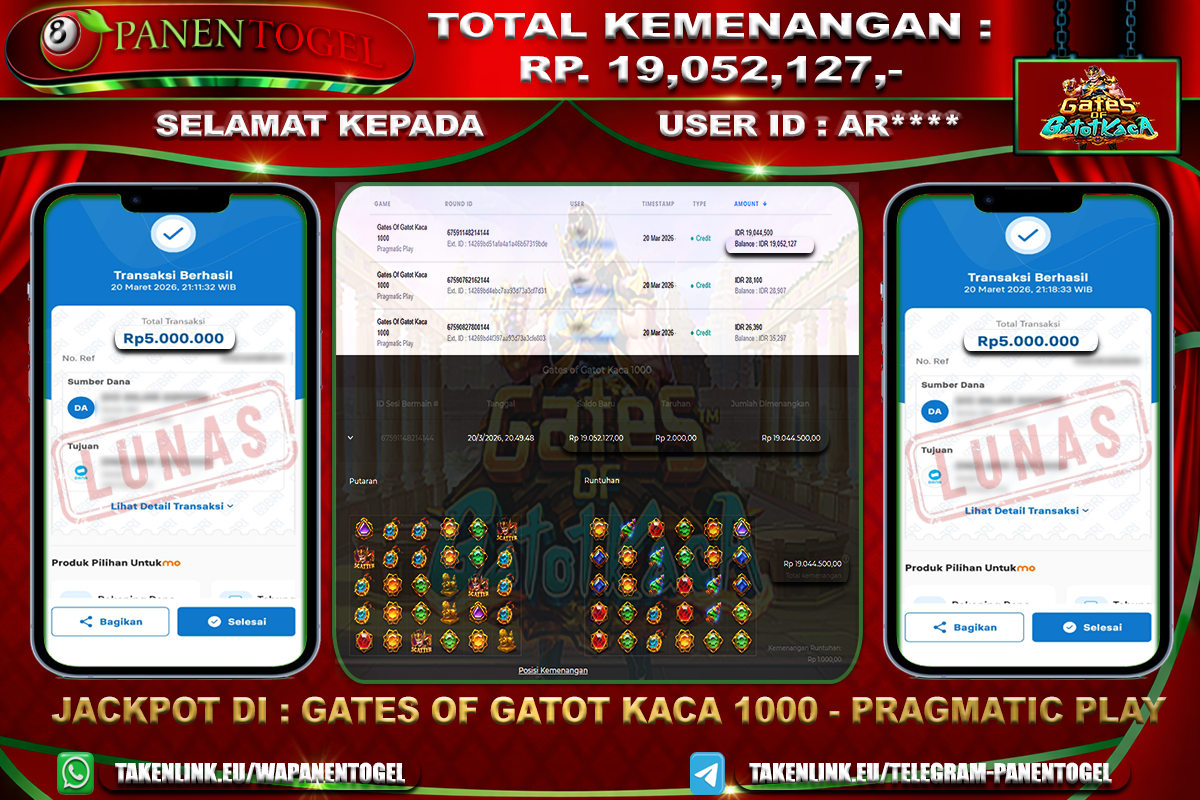 Selamat Kepada User ID : AR**** Member PANENTOGEL JACKPOT GATES OF GATOT KACA 1000