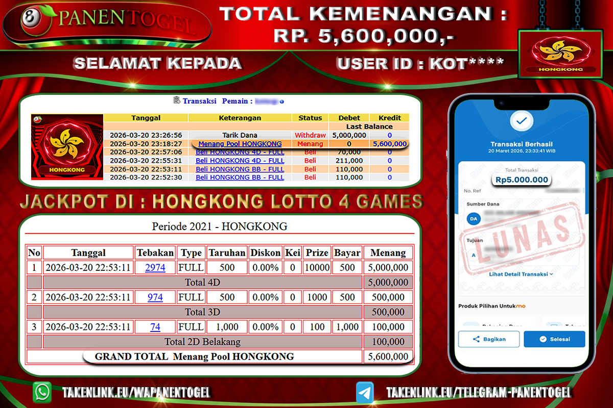BUKTI KEMENANGAN TOGEL HONGKONG LOTTO 4D GAMES PANENTOGEL Rp. 5.600.000, - LUNAS