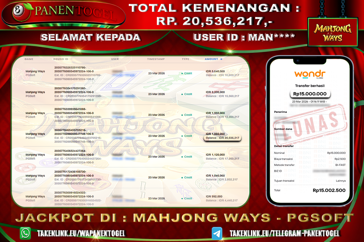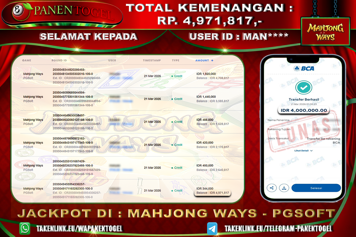 Selamat Kepada User ID : MAN**** Member PANENTOGEL JACKPOT MAHJONG WAYS