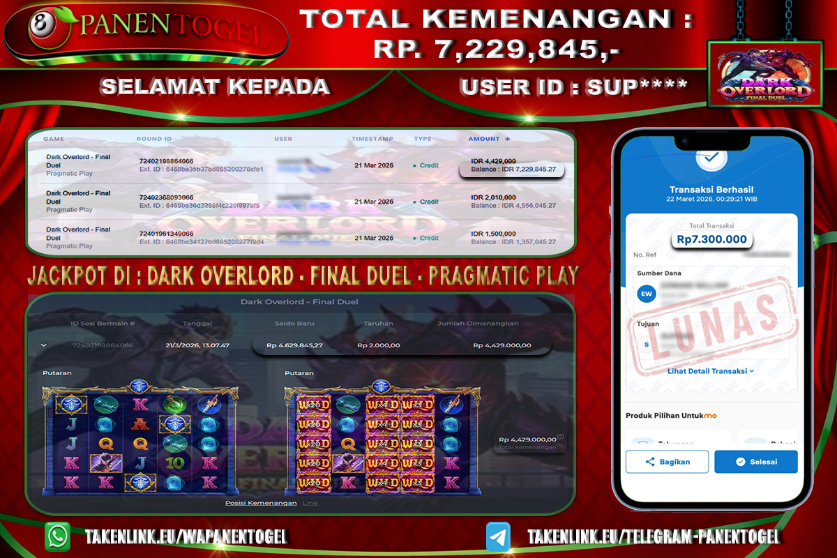 Selamat Kepada User ID : SUP**** Member PANENTOGEL JACKPOT DARK OVERLOAD FINAL DUEL PRAGMATIC PLAY