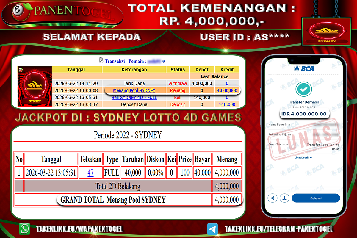 Selamat Kepada User ID : AS**** Member PANENTOGEL JACKPOT TOGEL SYDNEY LOTTO