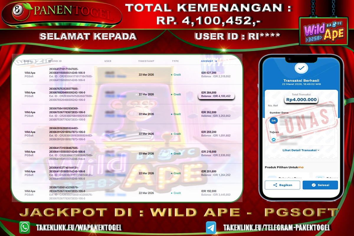 Selamat Kepada User ID : RI**** Member PANENTOGEL JACKPOT WILD APE