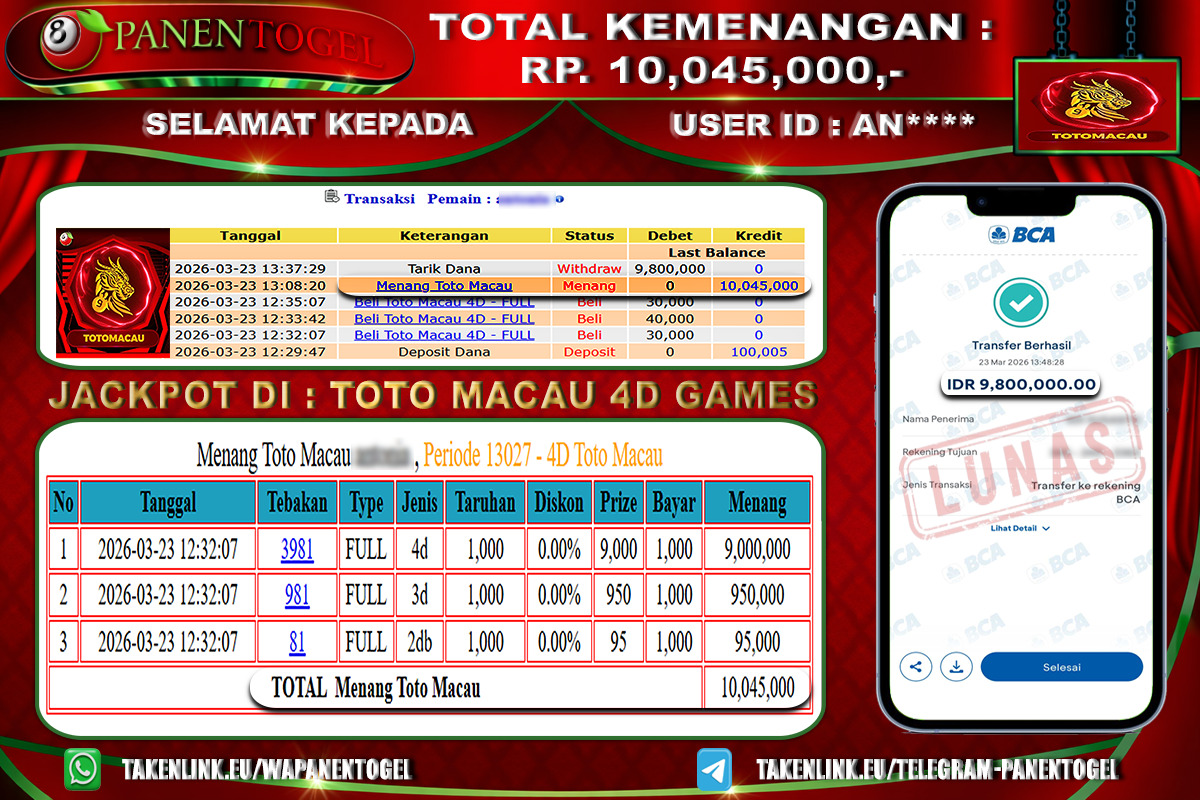 BUKTI KEMENANGAN TOGEL TOTO MACAU 4D GAMES PANENTOGEL Rp. 10.045.000, - LUNAS