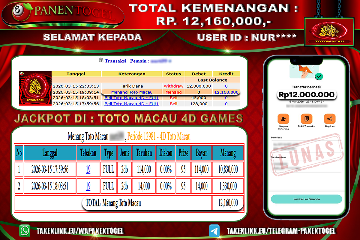 BUKTI KEMENANGAN TOGEL TOTO MACAU 4D GAMES PANENTOGEL Rp. 12.160.000, - LUNAS