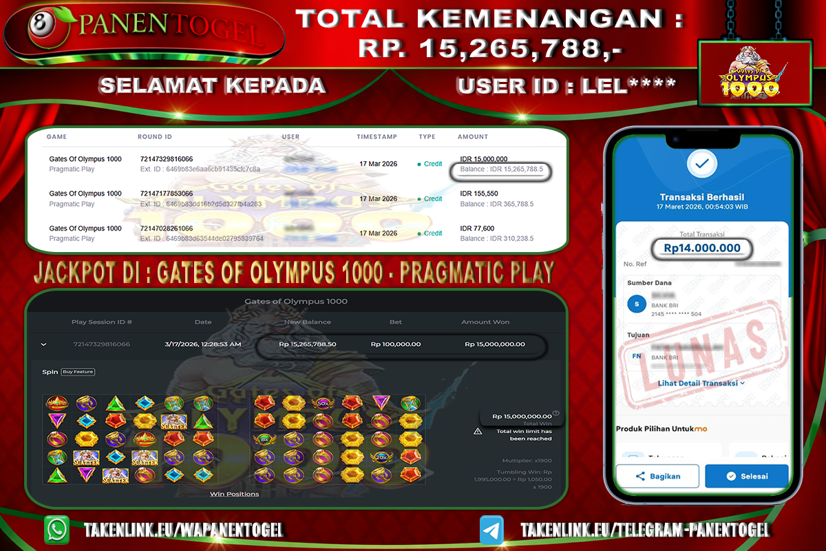 Selamat Kepada User ID : LEL**** Member PANENTOGEL JACKPOT GATES OF OLYMPUS 1000