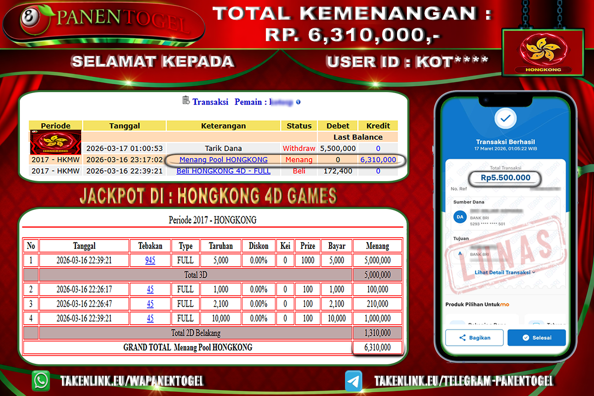 BUKTI KEMENANGAN TOGEL HONGKONG LOTTO 4D GAMES PANENTOGEL Rp. 6.310.000, - LUNAS