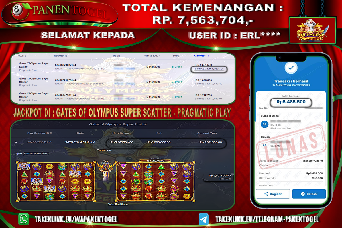 Selamat Kepada User ID : ERL**** Member PANENTOGEL JACKPOT GATES OF OLYMPUS SUPER SCATTER