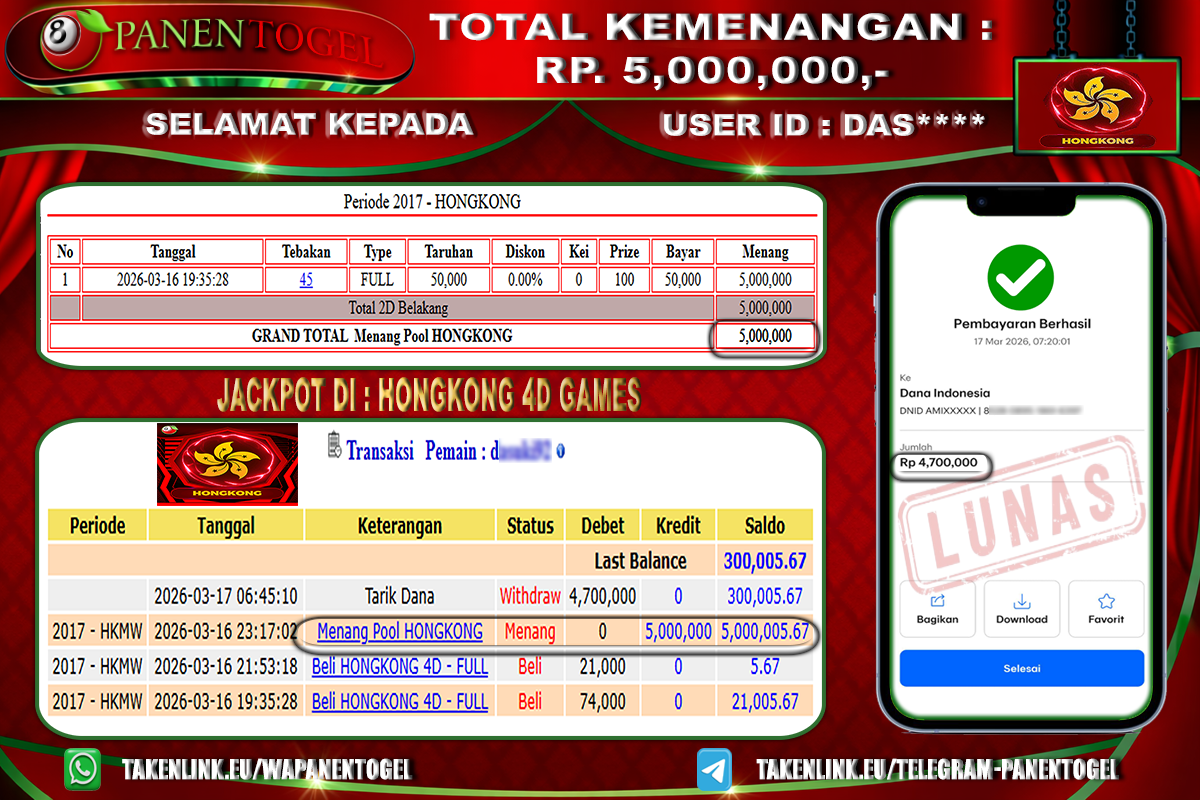 BUKTI KEMENANGAN TOGEL HONGKONG LOTTO 4D GAMES PANENTOGEL Rp. 5.000.000, - LUNAS