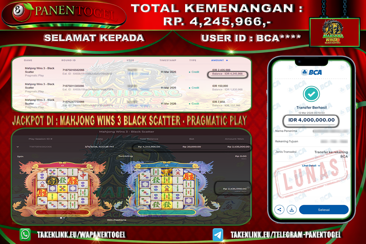 Selamat Kepada User ID : BCA**** Member PANENTOGEL JACKPOT MAHJONG WINS 3 BLACK SCATTER
