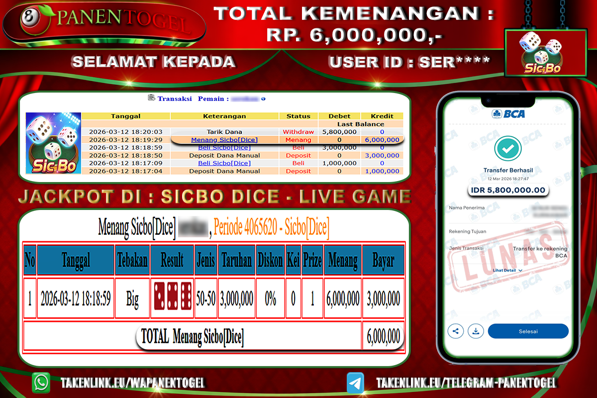 BUKTI KEMENANGAN CASINO SICBO DICE PANENTOGEL Rp. 6.000.000, - LUNAS
