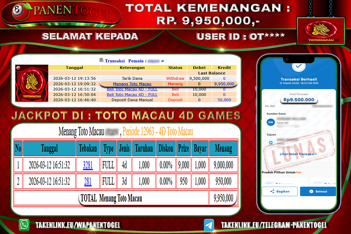 BUKTI KEMENANGAN TOGEL TOTO MACAU 4D GAMES PANENTOGEL Rp. 9.950.000, - LUNAS