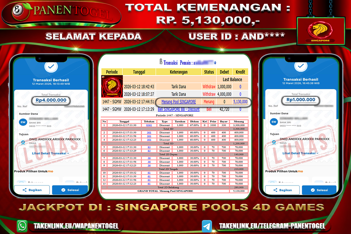 Selamat Kepada User ID : AND**** Member PANENTOGEL JACKPOT TOGEL SINGAPORE POOLS