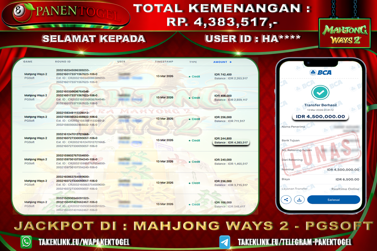 Selamat Kepada User ID : HA**** Member PANENTOGEL JACKPOT MAHJONG WAYS 2
