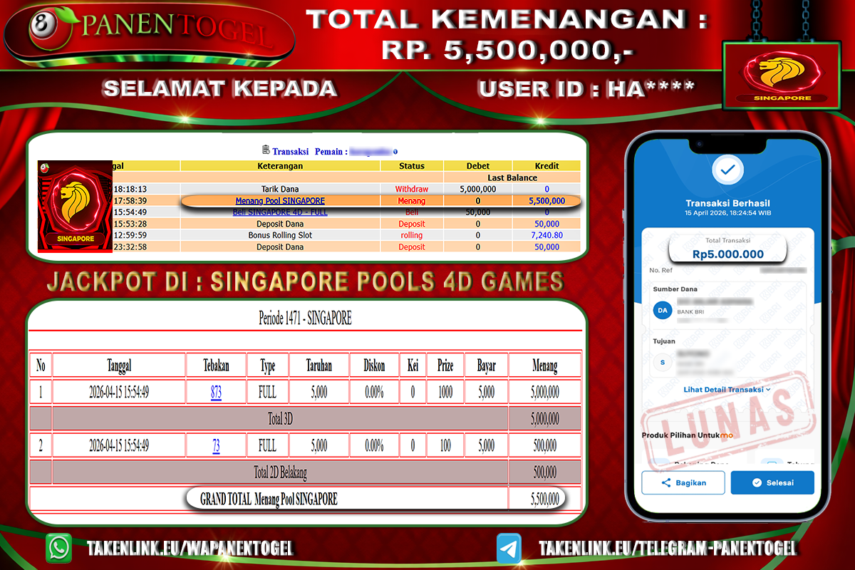 Selamat Kepada User ID : BAR**** Member PANENTOGEL JACKPOT TOGEL SINGAPORE POOLS