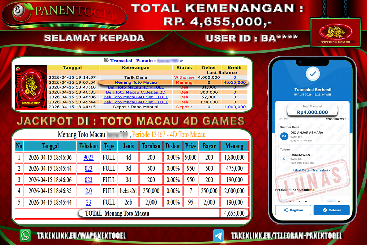 BUKTI KEMENANGAN TOGEL TOTO MACAU 4D GAMES PANENTOGEL Rp. 4,655,000 - LUNAS