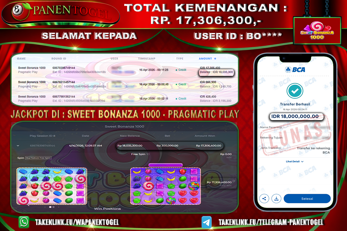 Selamat Kepada User ID : BO**** Member PANENTOGEL JACKPOT SWEET BONANZA 1000