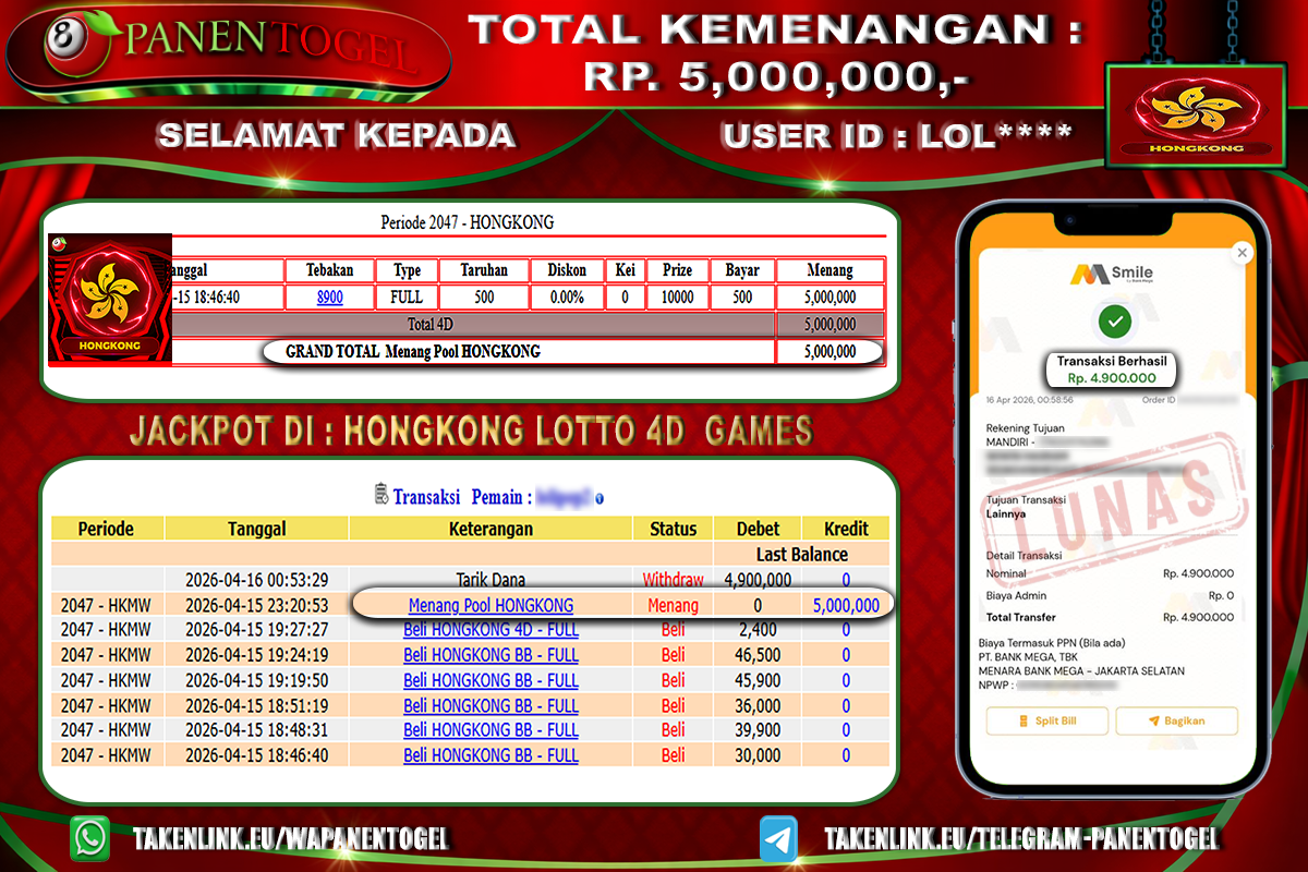 BUKTI KEMENANGAN TOGEL HONGKONG LOTTO 4D GAMES PANENTOGEL Rp. 5,000,000 - LUNAS