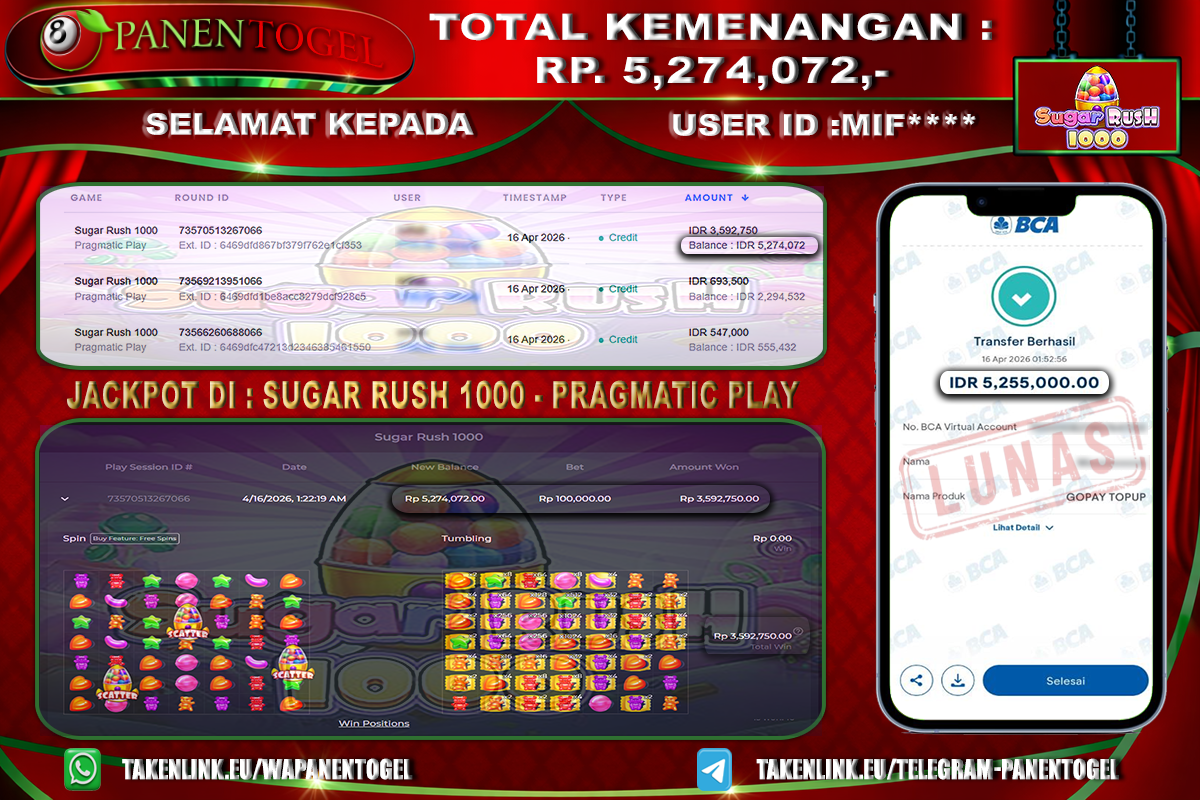 Selamat Kepada User ID : MIF**** Member PANENTOGEL JACKPOT SUGAR RUSH 1000