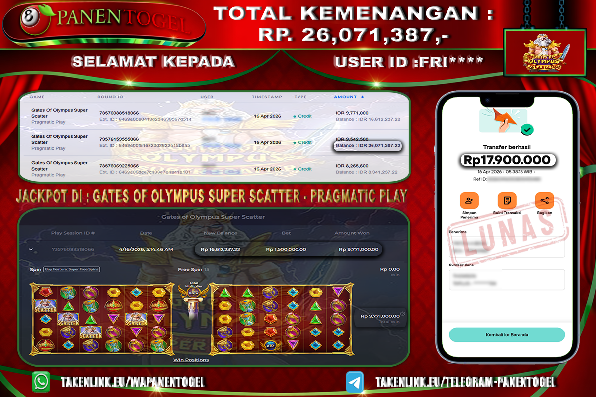 Selamat Kepada User ID : FRI**** Member PANENTOGEL JACKPOT SLOT GATES OF OLYMPUS SUPER SCATTER