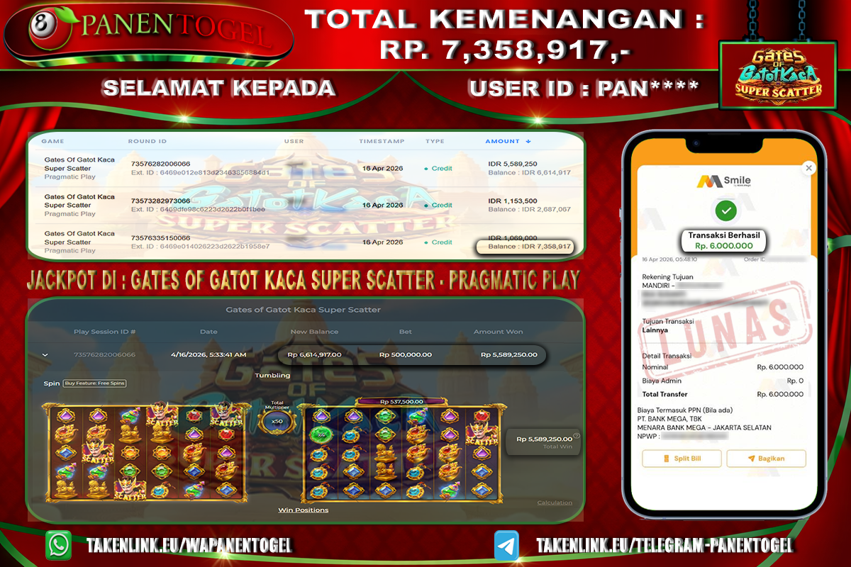 Selamat Kepada User ID : PAN**** Member PANENTOGEL JACKPOT GATES OF GATOT KACA 1000