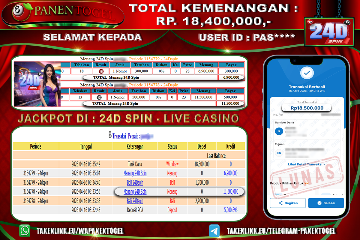 BUKTI KEMENANGAN LIVE CASINO PANENTOGEL RP. 18,400,000 - LUNAS
