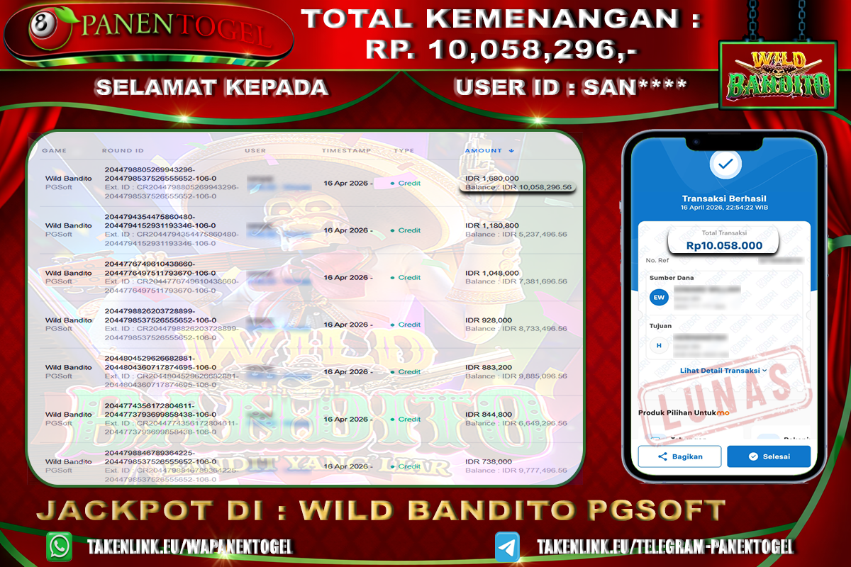 Selamat Kepada User ID : SAN**** Member PANENTOGEL JACKPOT WILD BANDITO