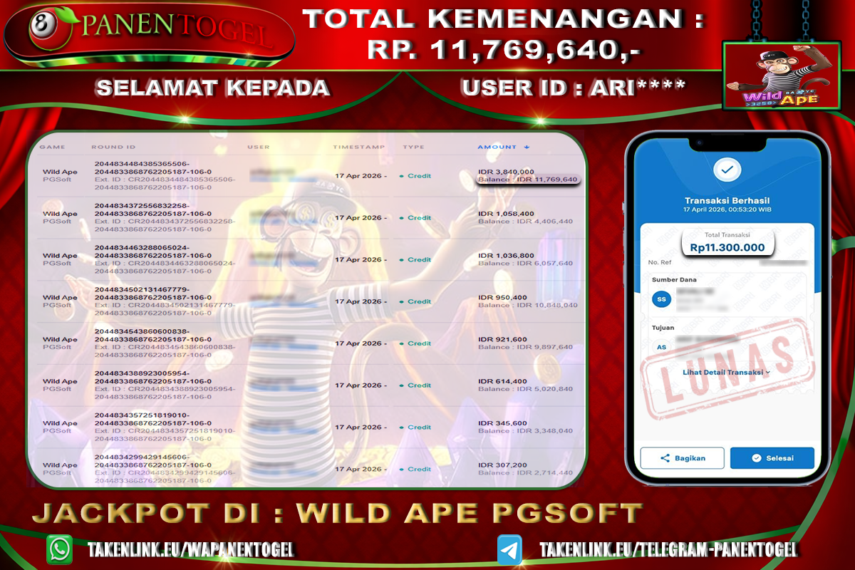 Selamat Kepada User ID : ARI*** Member PANENTOGEL JACKPOT WILD APE