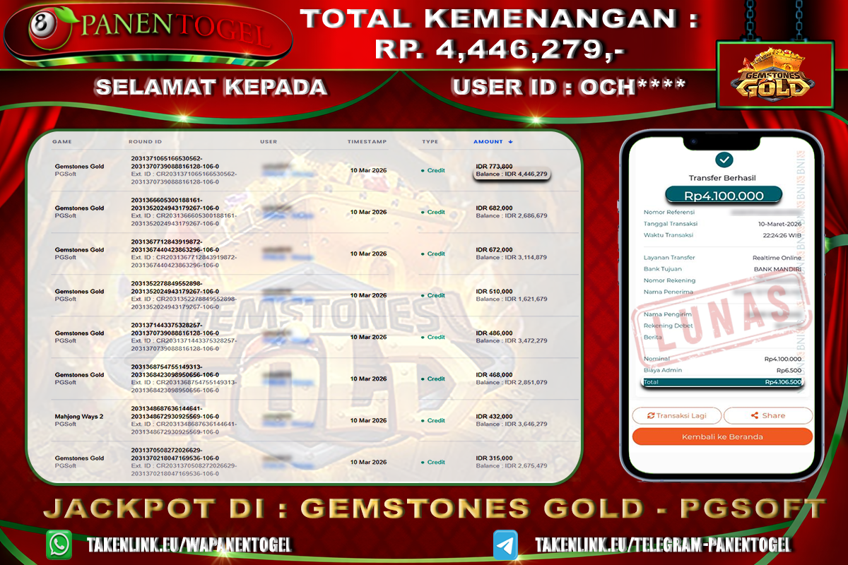 Selamat Kepada User ID : OCH**** Member PANENTOGEL JACKPOT SLOT GEMSTONES GOLD PG SOFT
