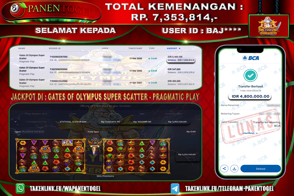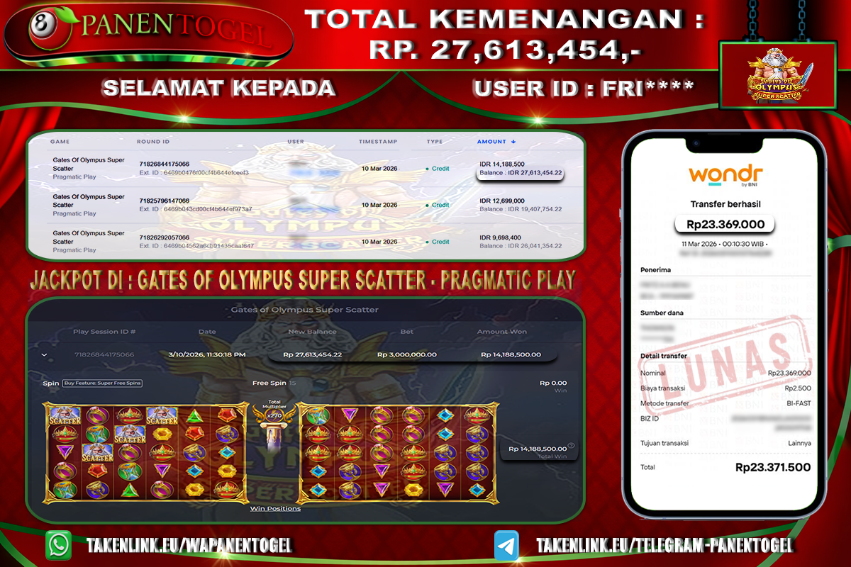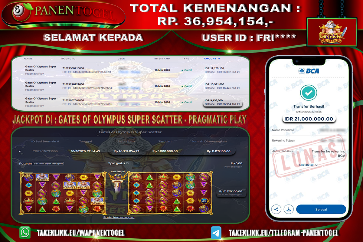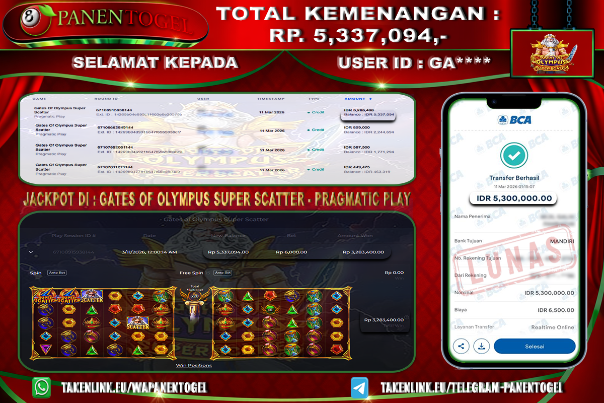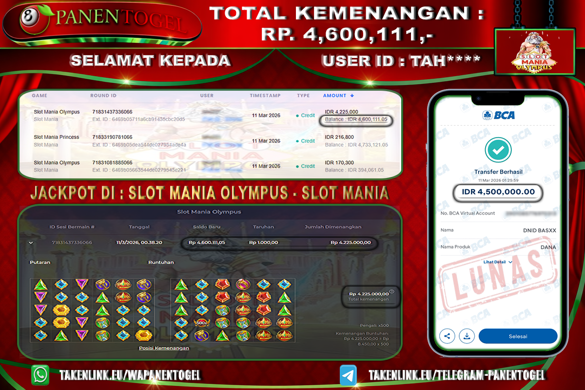 Selamat Kepada User ID : TAH**** Member PANENTOGEL JACKPOT MANIA OLYMPUS