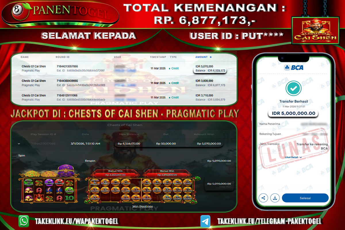 Selamat Kepada User ID : PUT**** Member PANENTOGEL JACKPOT CHESTS OF CAI SHEN