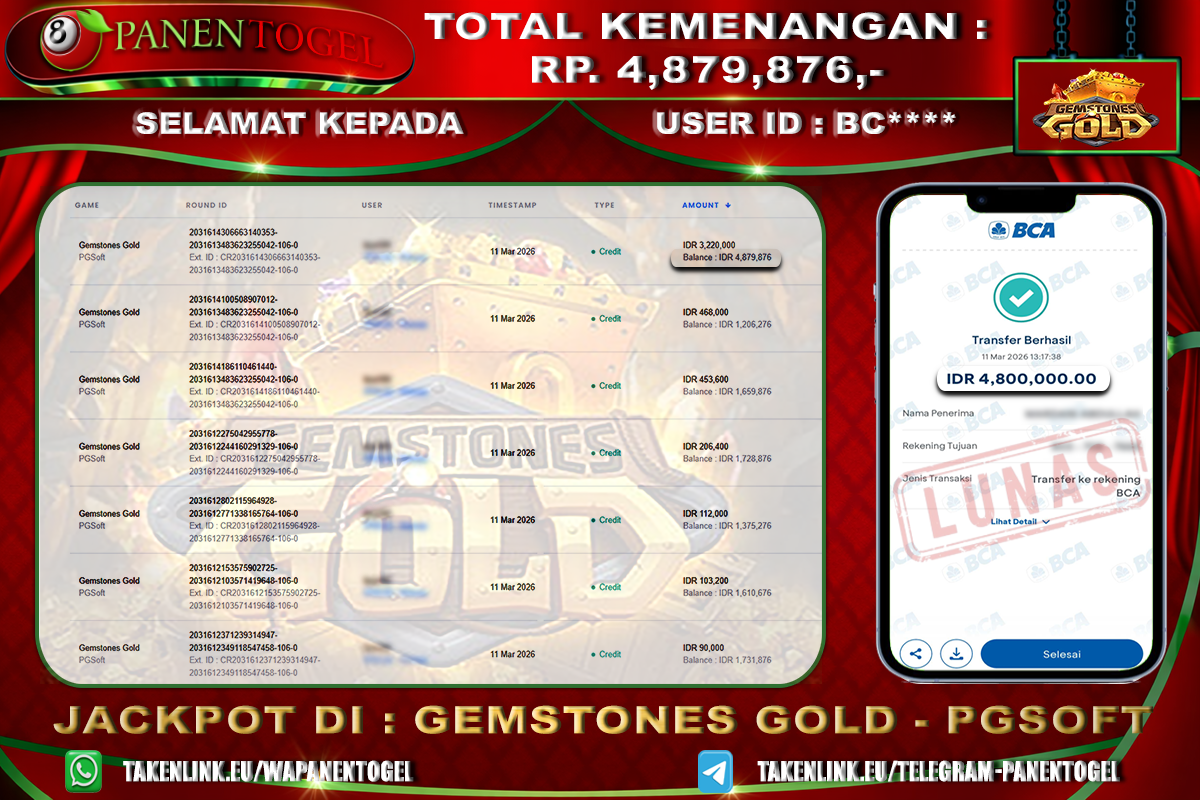 Selamat Kepada User ID : BC**** Member PANENTOGEL JACKPOT SLOT GEMSTONES GOLD PG SOFT