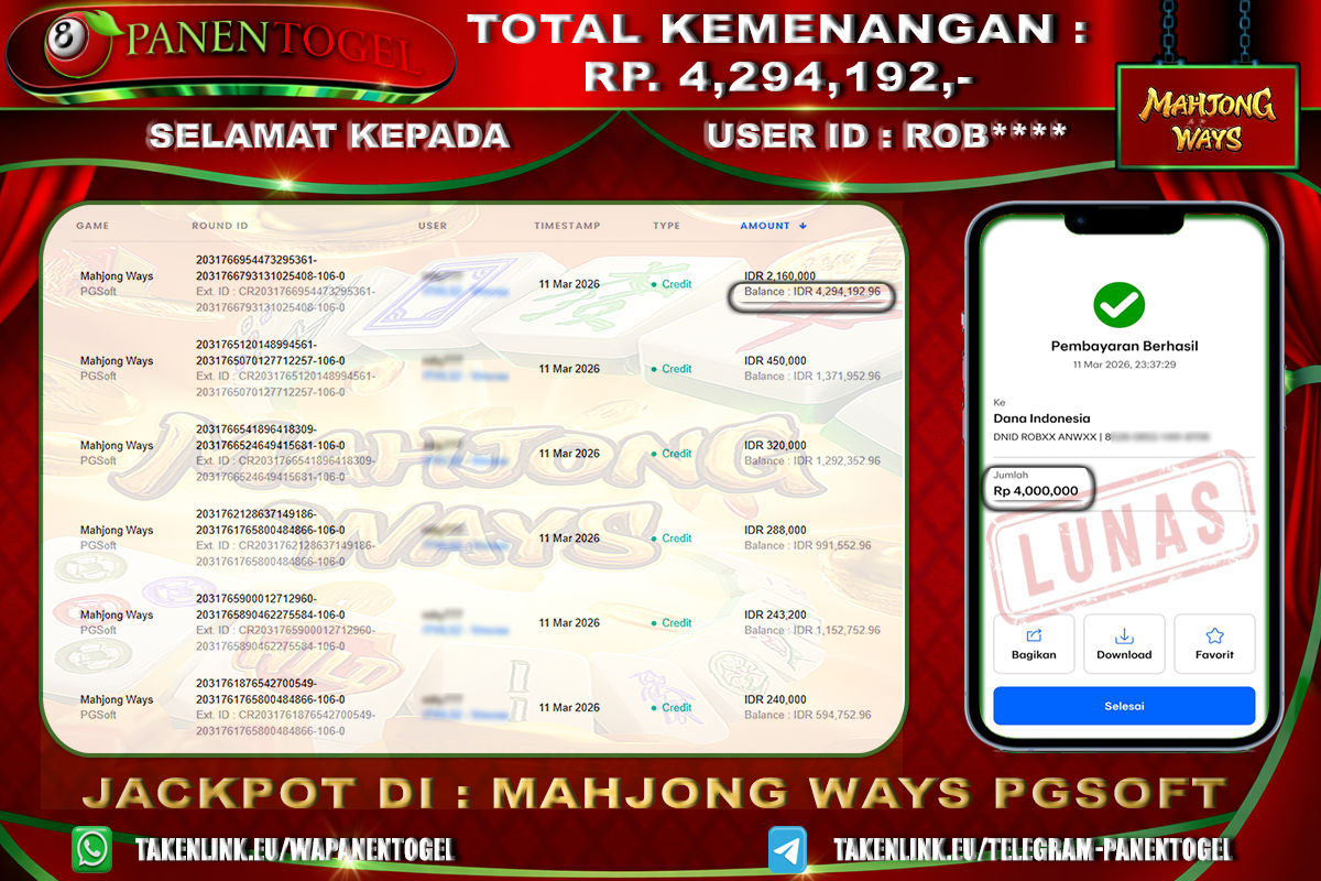 Selamat Kepada User ID : ROB**** Member PANENTOGEL JACKPOT MAHJONG WAYS