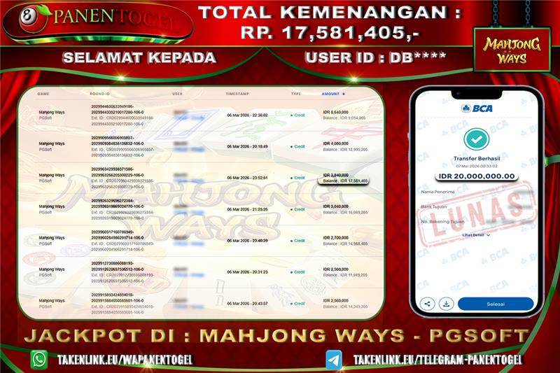 Selamat Kepada User ID : DB**** Member PANENTOGEL JACKPOT MAHJONG WAYS