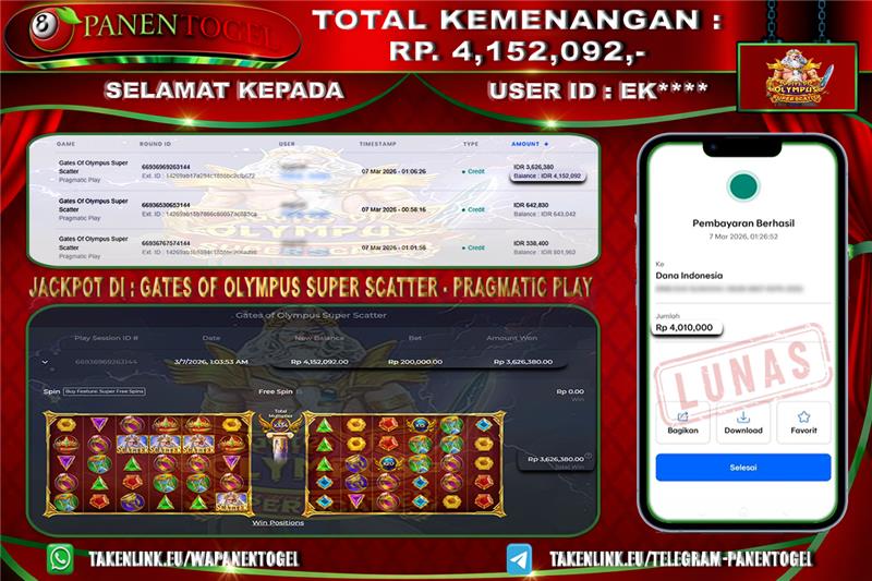 Selamat Kepada User ID : EK**** Member PANENTOGEL JACKPOT GATES OF OLYMPUS SUPER SCATTER