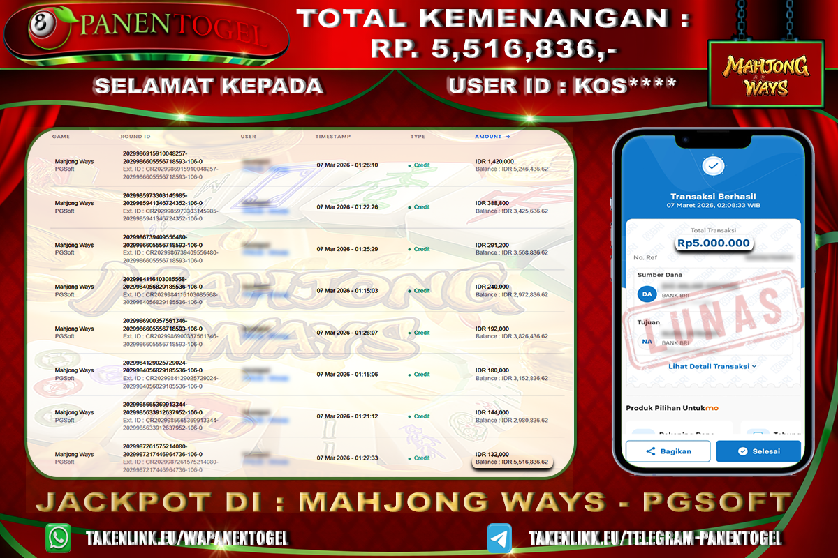 Selamat Kepada User ID : KOS**** Member PANENTOGEL JACKPOT MAHJONG WAYS