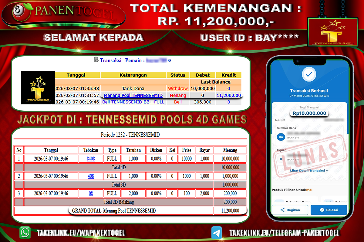 Selamat Kepada User ID : BAY**** Member PANENTOGEL JACKPOT TOGEL TENNESSEMID POOLS 4D GAMES