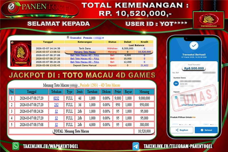 BUKTI KEMENANGAN TOGEL PANENTOGEL Rp. 10.520.000, - LUNAS