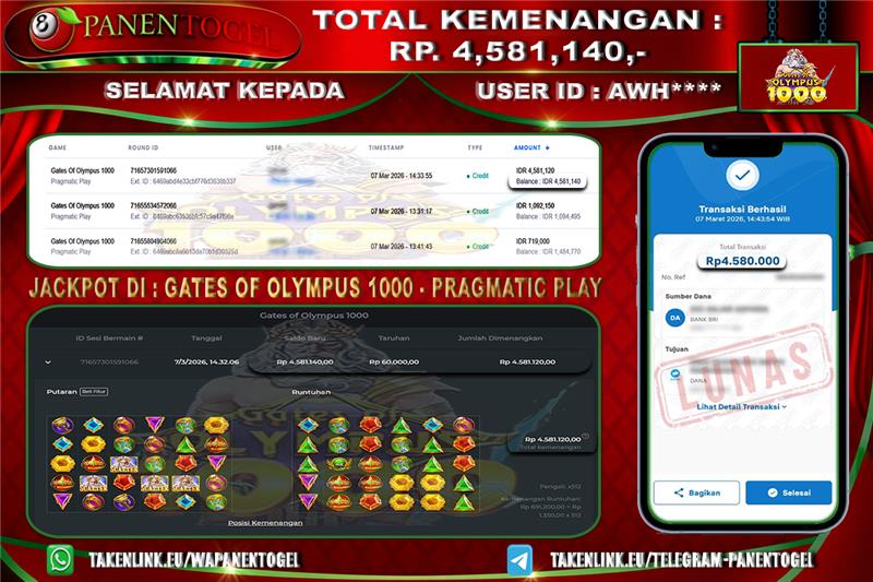 Selamat Kepada User ID : AWH**** Member PANENTOGEL JACKPOT GATES OF OLYMPUS 1000