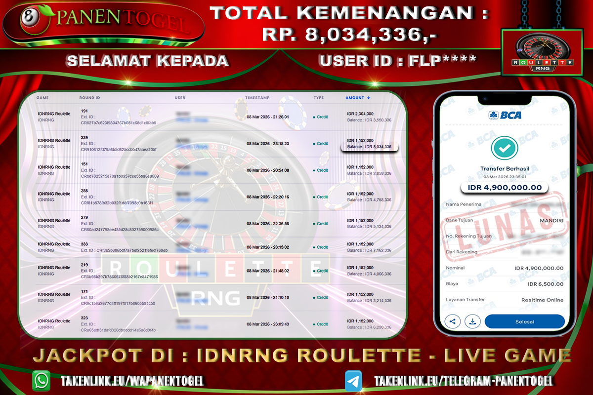 Selamat Kepada User ID : FLP**** Member PANENTOGEL JACKPOT LIVE GAME IDNRNG ROULETTE